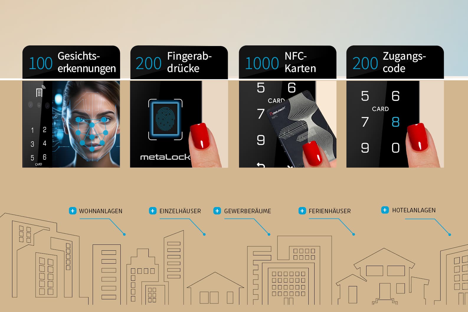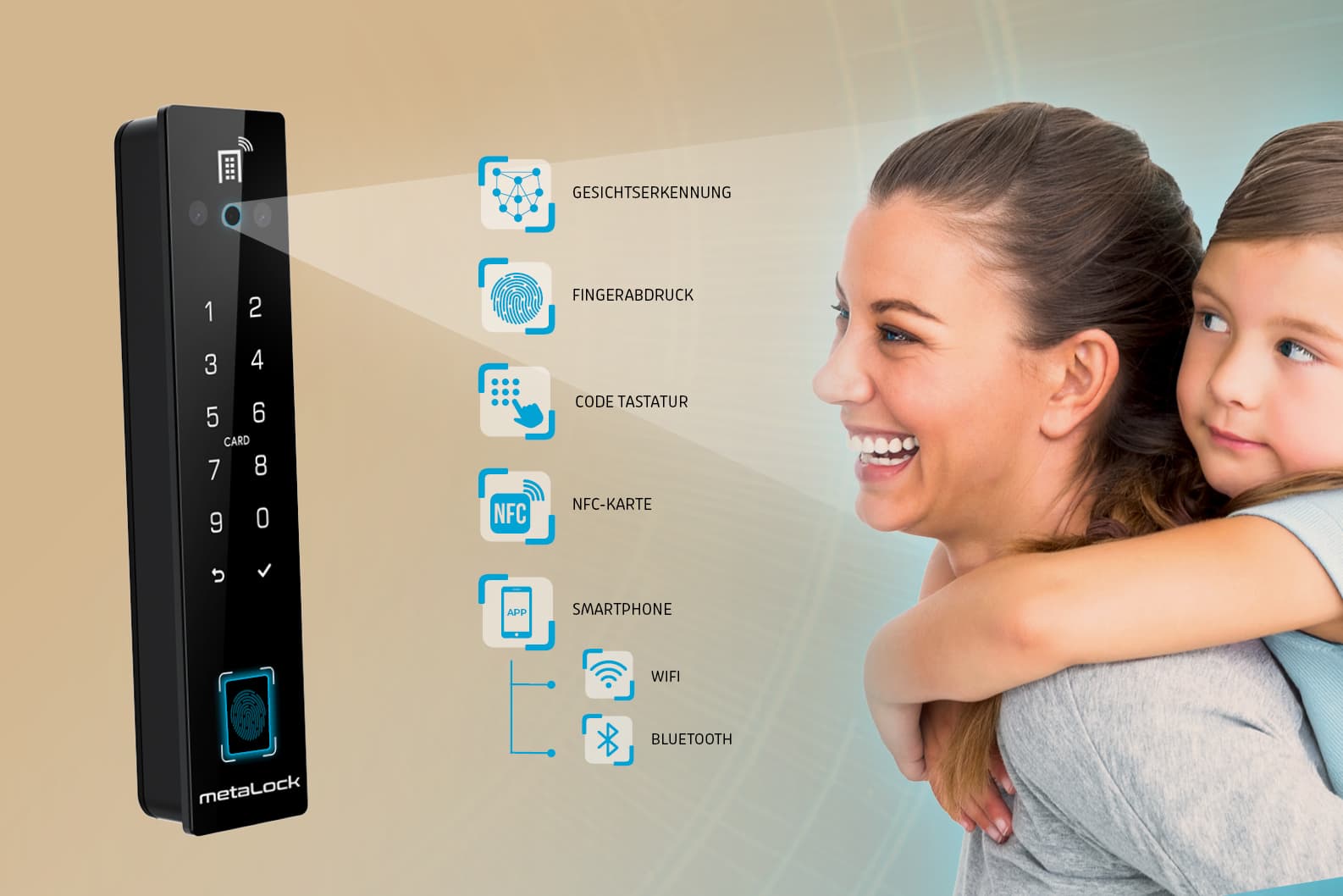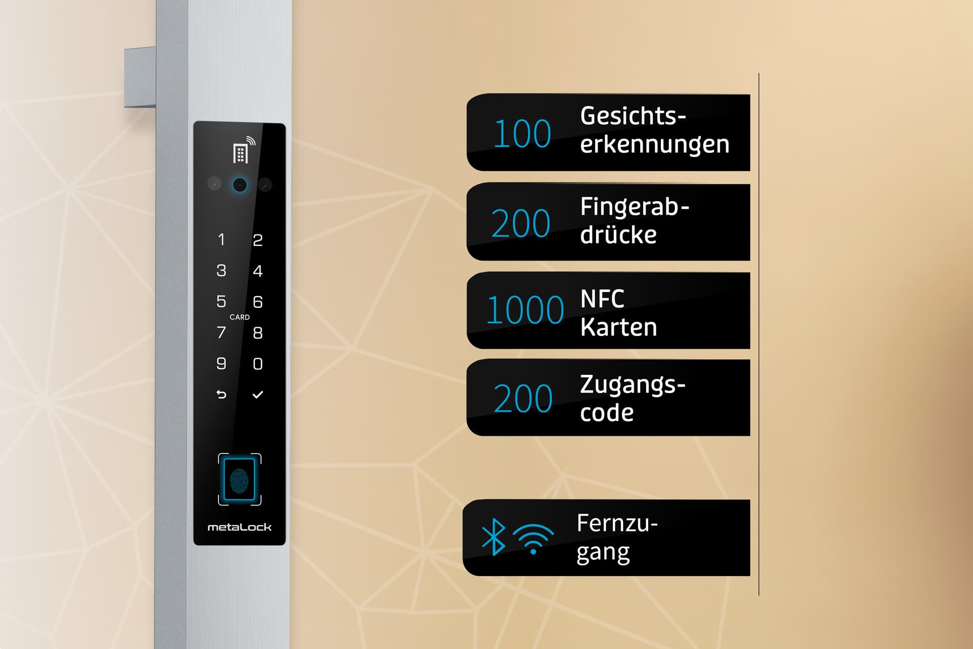 MetaLock 3D Smartschloss ermöglicht das schnellste und innovativste Türöffnen mit fortschrittlicher Gesichtserkennungstechnologie, die ein einfaches und sorgenfreies Entriegeln gewährleistet. Zudem umfasst es das Öffnen per Fingerabdruck, Code-Tastatur und NFC-Leser.Die App* bietet vollständige Kontrolle über den Zugang, ermöglicht Fernzugriff und die präzise Überwachung aller Aktivitäten.Mit dem metaLock 3D smarten Schloss sorgen Sie für Ihre Sicherheit und Ihren Komfort – egal, wo Sie sind.
