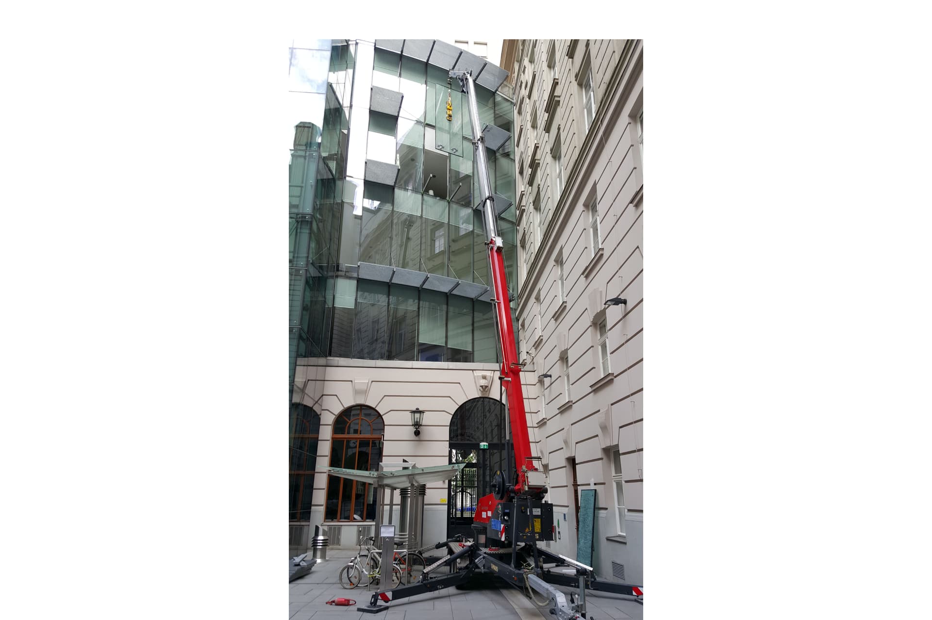 - Dank einzeln klapp- und teleskopierbaren Stützen ist der Kran auch in engen oder unebenen Platzverhältnissen sicher einsetzbar (Treppen, hohe Bordsteine, unebene Baustellen).