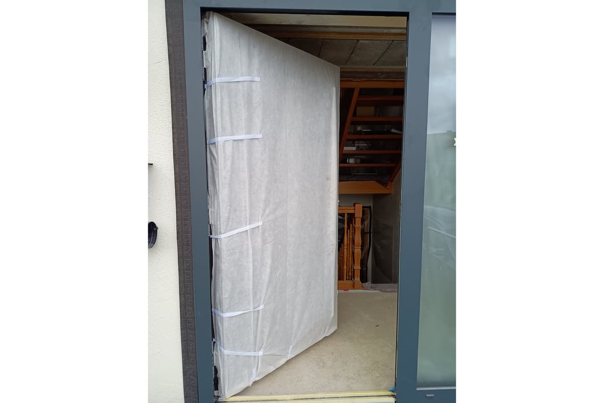 Unser Produkt schützt Haustüren vor Staub, Schmutz und leichten Beschädigungen während der gesamten Bauphase. Die Schutzhaube wird über den Türflügel gezogen und mit mehreren Klettverschlüssen verschlossen.