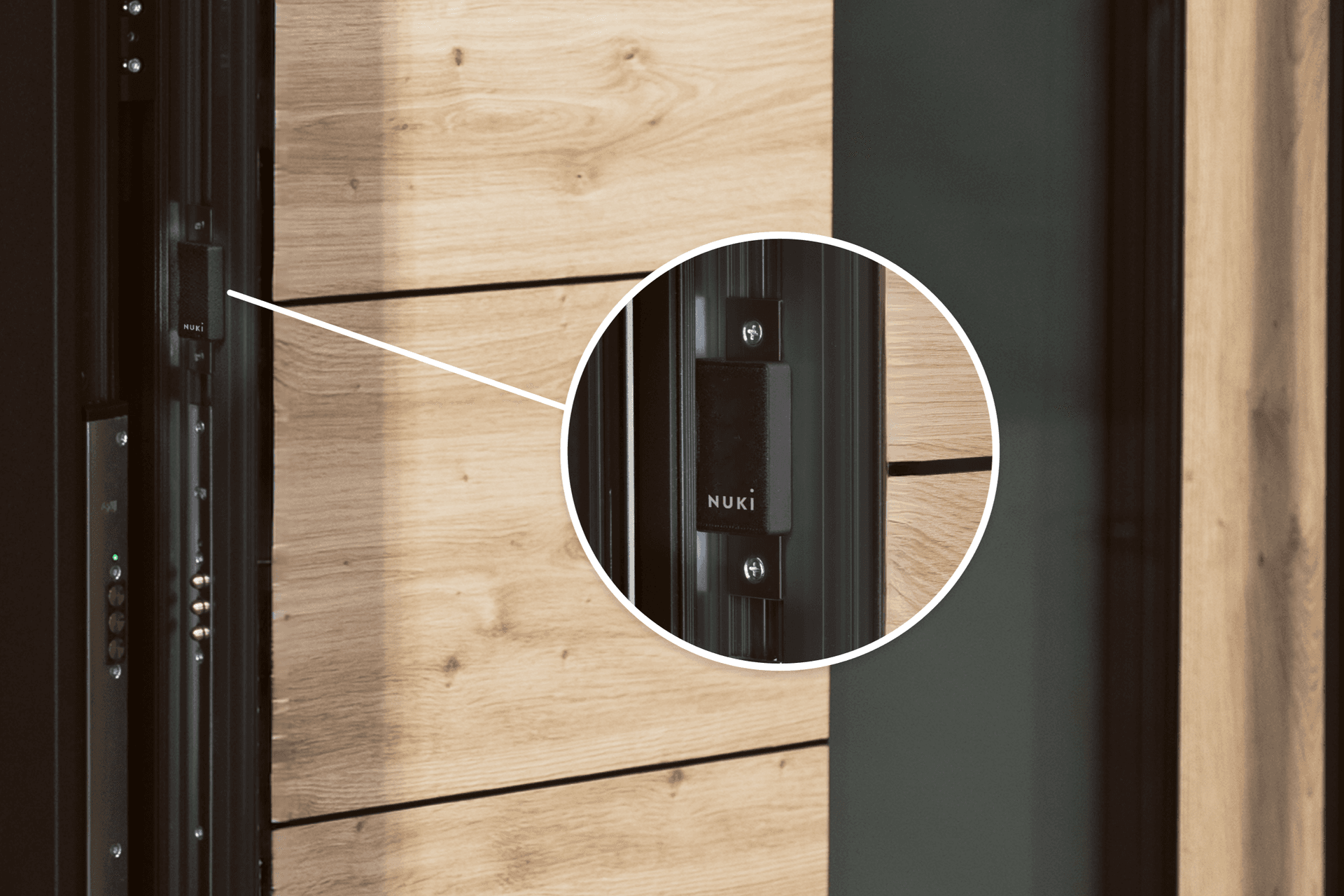 - The Nuki Smart Module is integrated invisibly into the door, keeping a premium design without visible hardware.